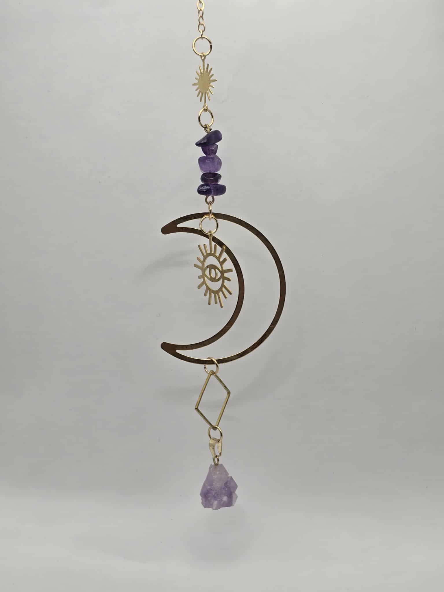 Ces attrapes-soleil dorés sont ornés de véritables éclats d’améthyste, pierre de calme et de protection