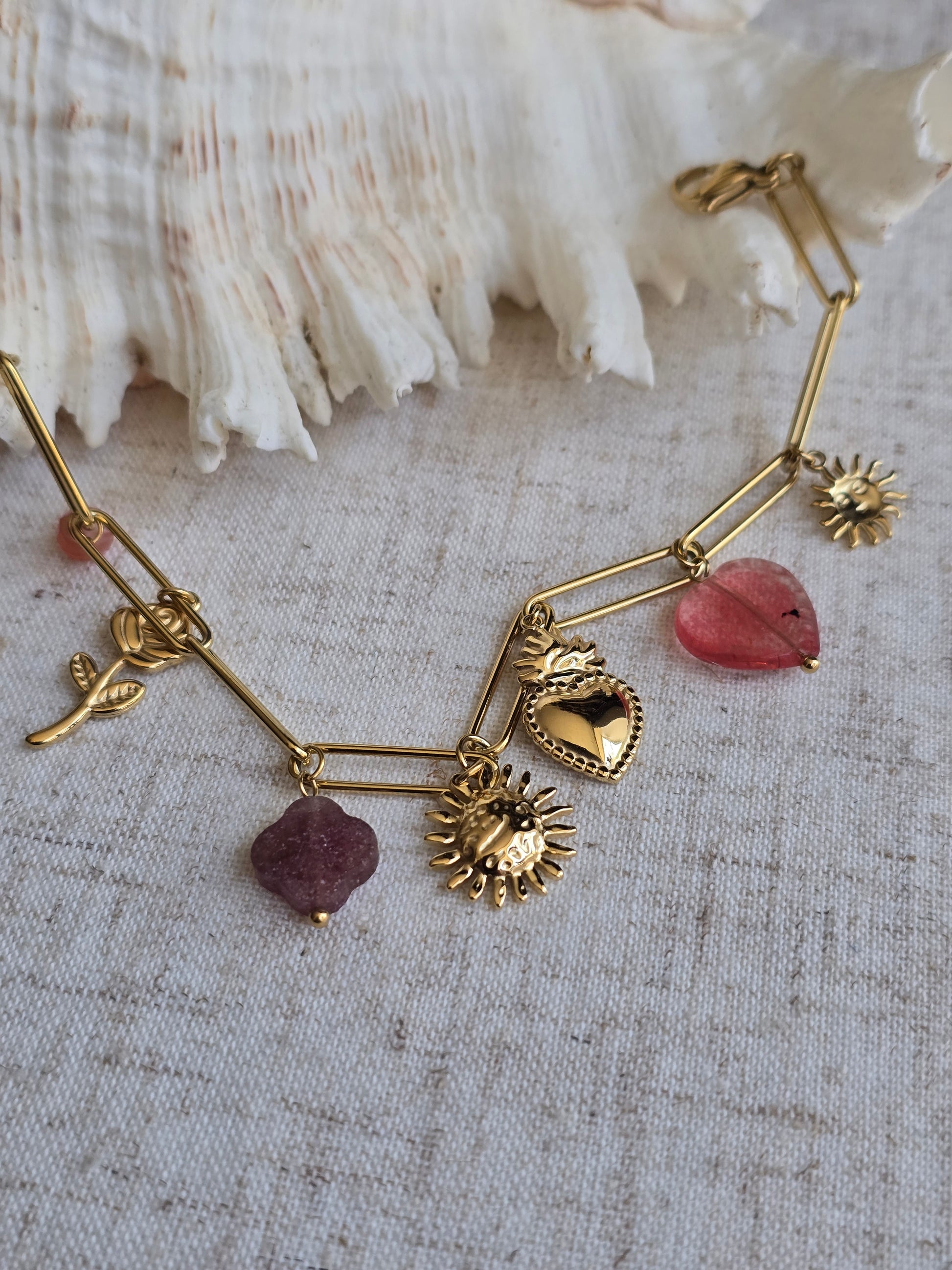 Ce bracelet breloque en acier inoxydable est composé de pierres naturelles mais également de perles synthétiques et de breloques.