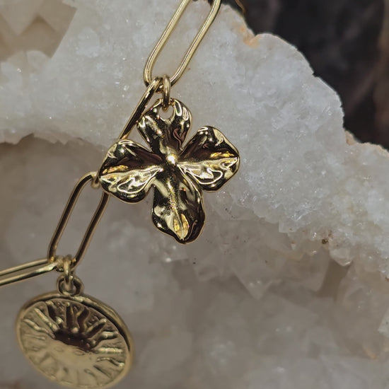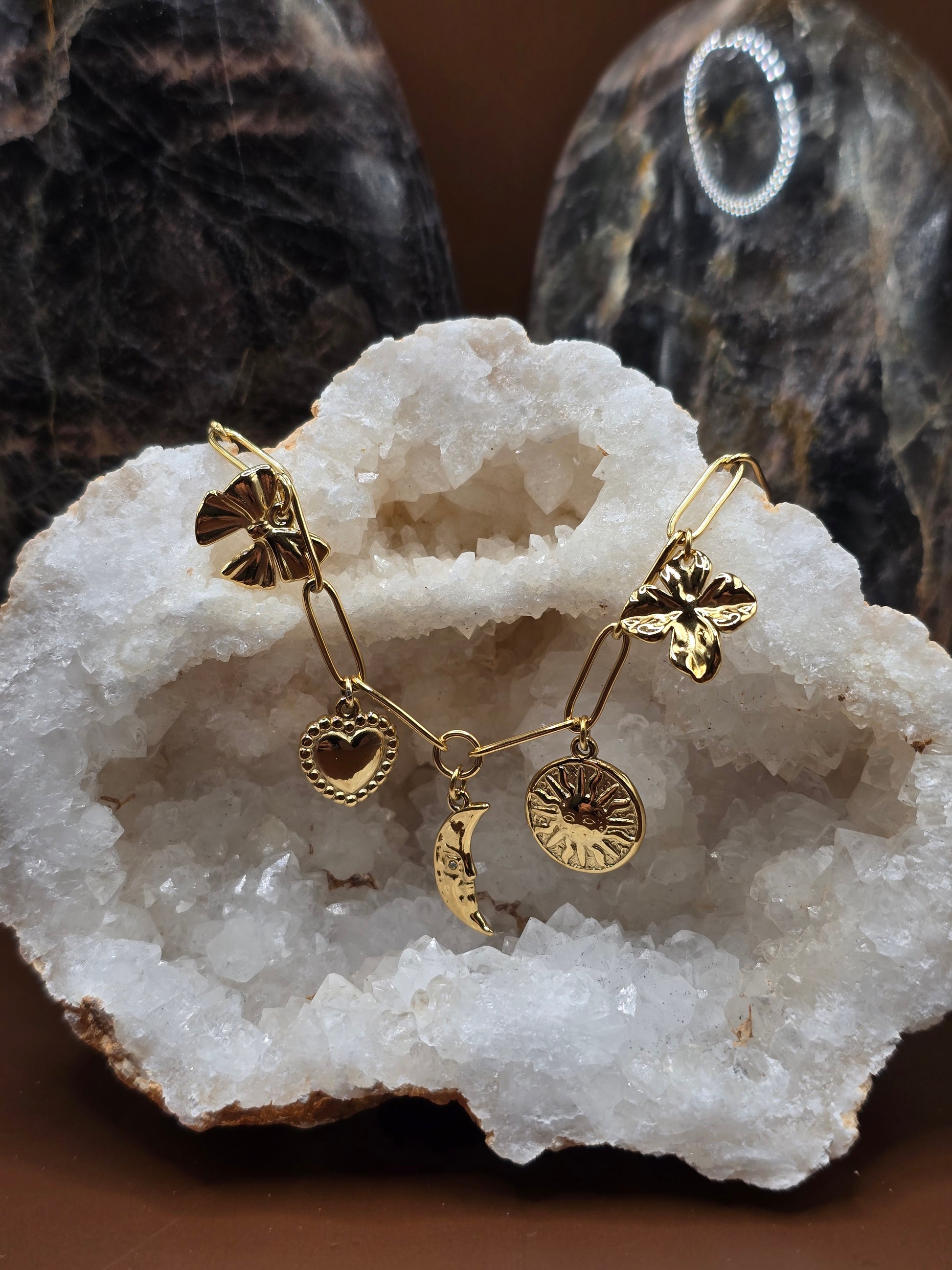 Sur une chaîne à maillons rectangulaires en acier inoxydable doré, se balancent 6 charms porte-bonheur finement travaillés :