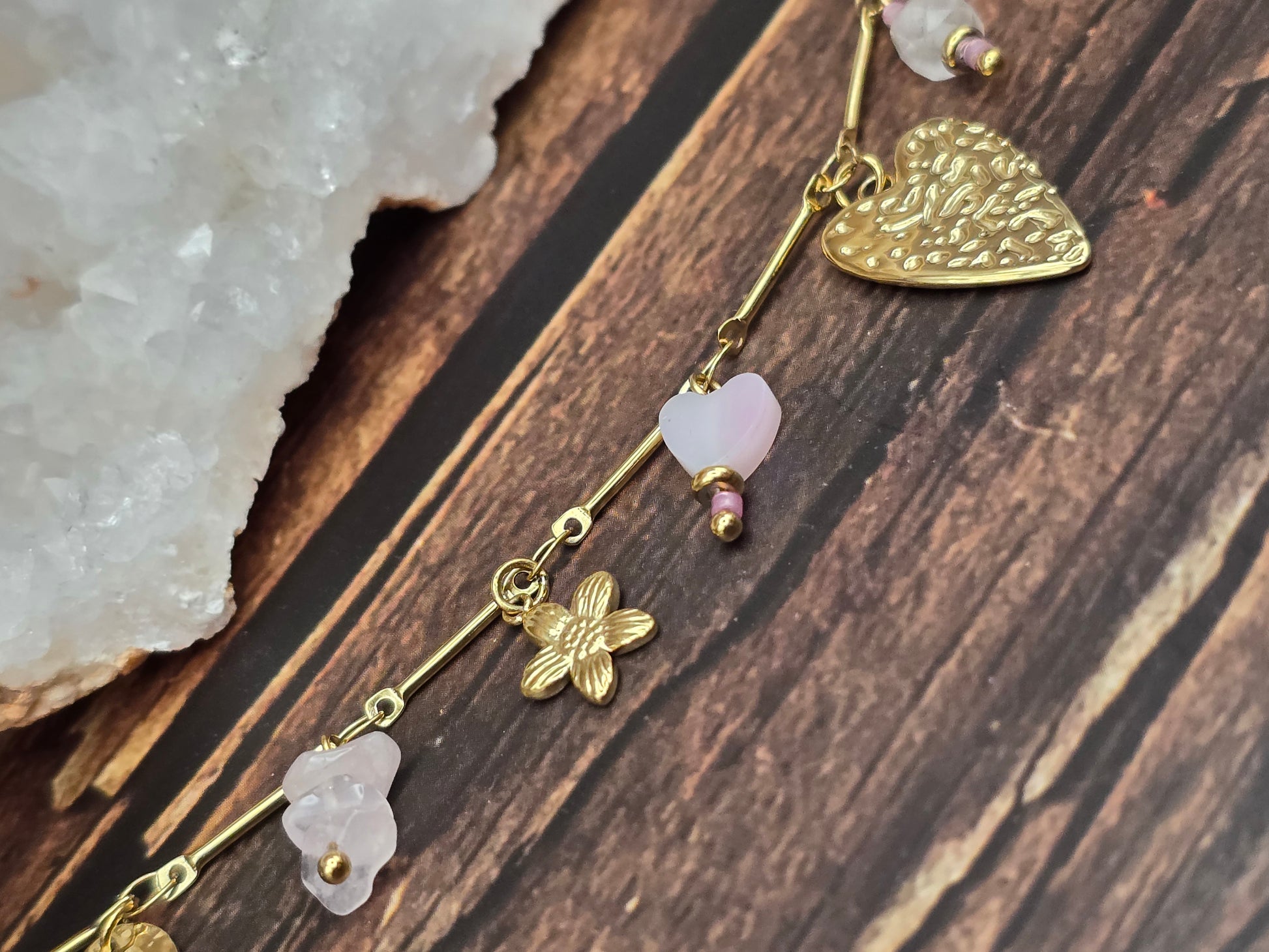 Le bracelet Daphne est une création délicate composée de quartz rose, pierre de l’amour et de la douceur. Ses petites breloques féminines et sa chaîne en acier inoxydable doré lui donnent un style romantique et élégant.