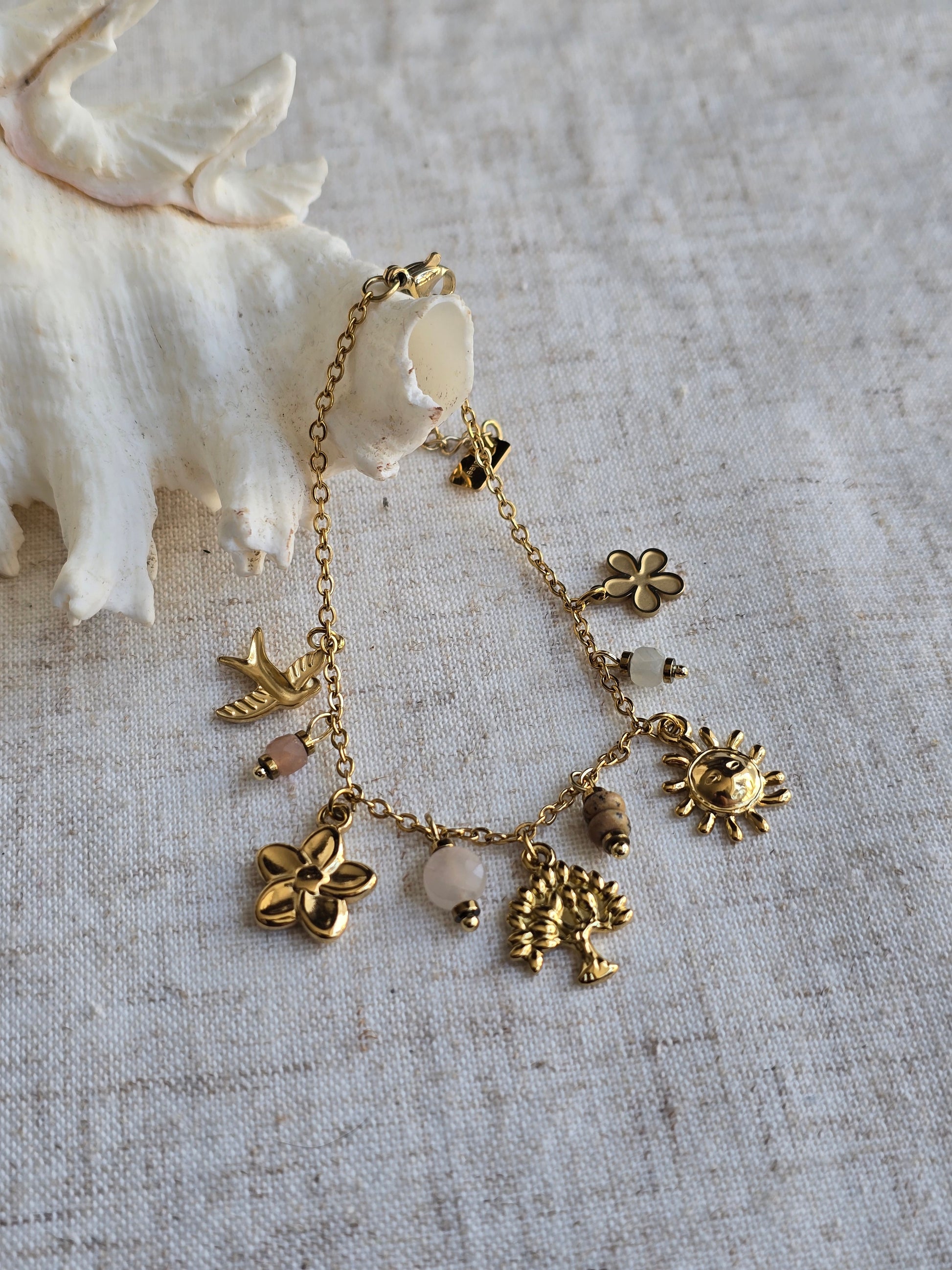 Composé d’une chaîne fine dorée et parsemé de breloques pleines de sens ... soleil rayonnant, oiseau en vol, arbre de vie, fleurs .