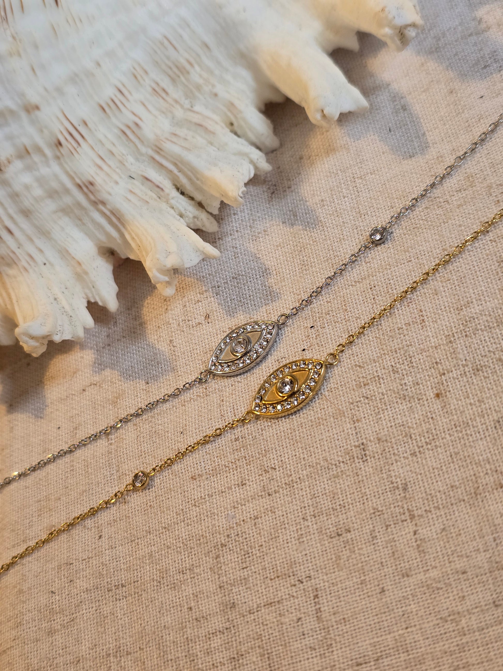Un bijou fin et raffiné qui allie élégance et symbolisme. Ce bracelet minimaliste est orné d’un œil protecteur serti de strass scintillants, symbole universel de protection et d’intuition. Disponible en version dorée et argentée, il s’adapte à toutes vos envies et à vos tenues, de jour comme de nuit.