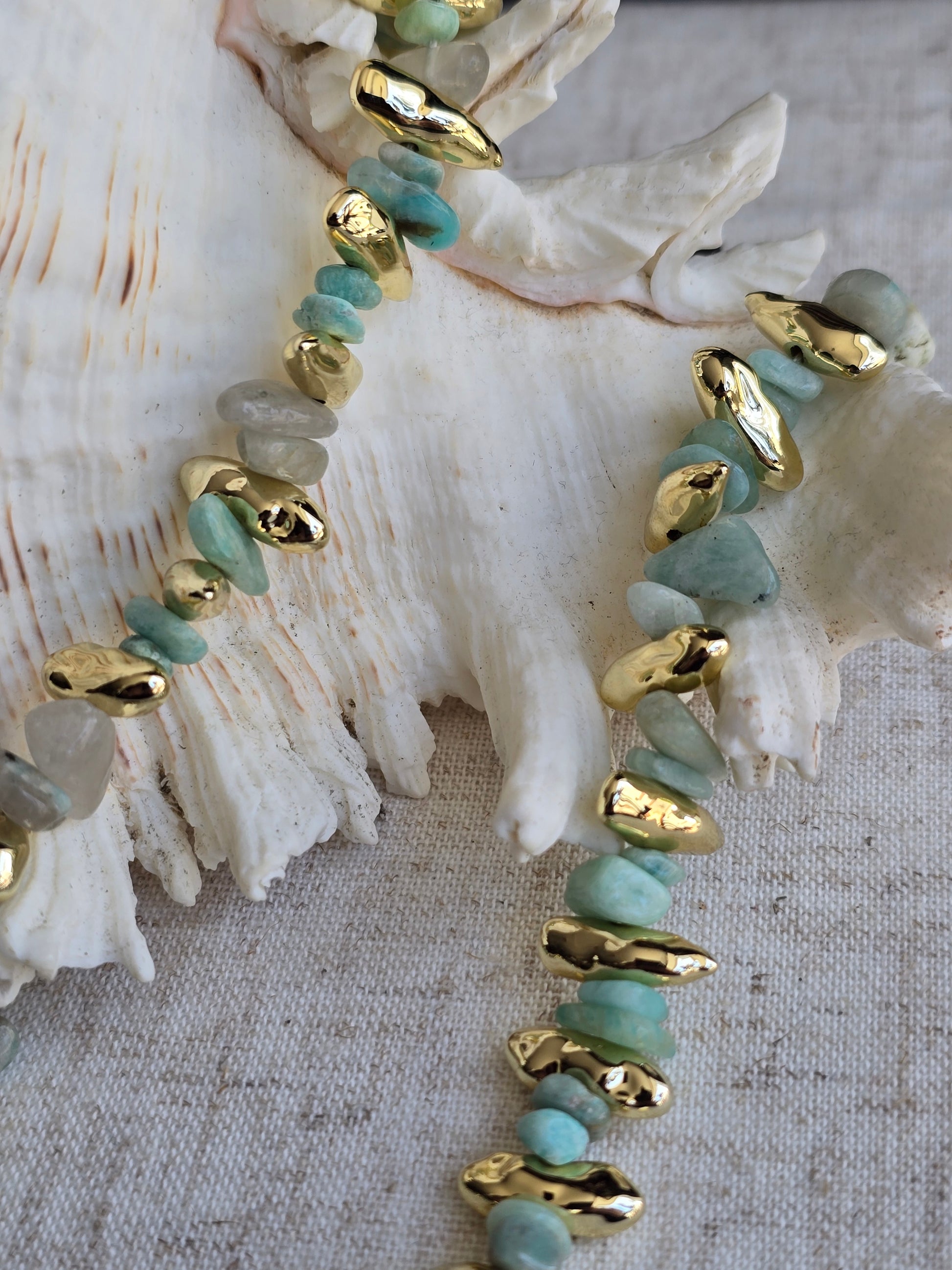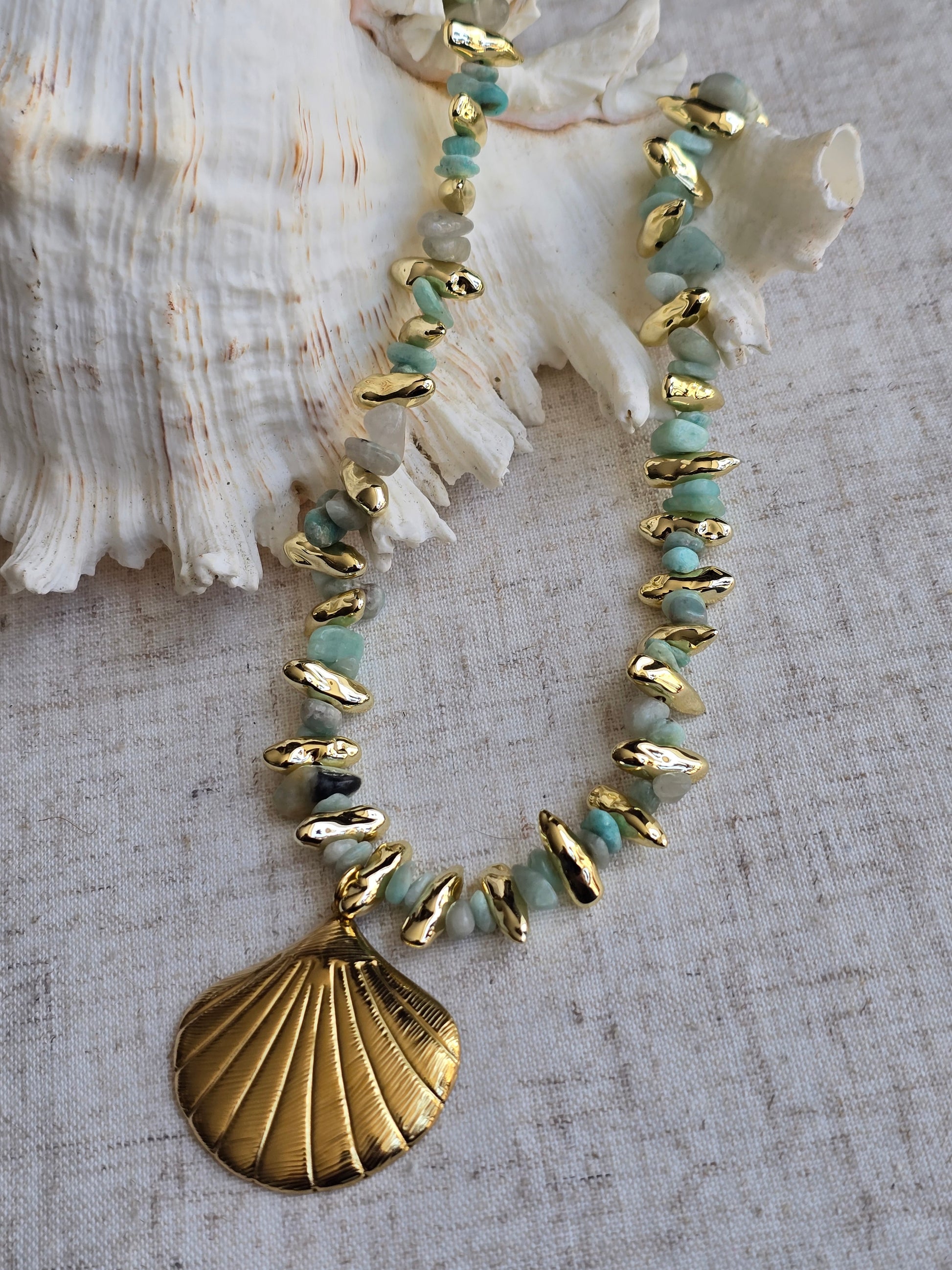 Son pendentif coquillage doré texturé capte la lumière avec subtilité, suspendu à un collier composé d’éclats de pierres naturelles et d’éléments irréguliers dorés pour un effet brut et précieux à la fois.