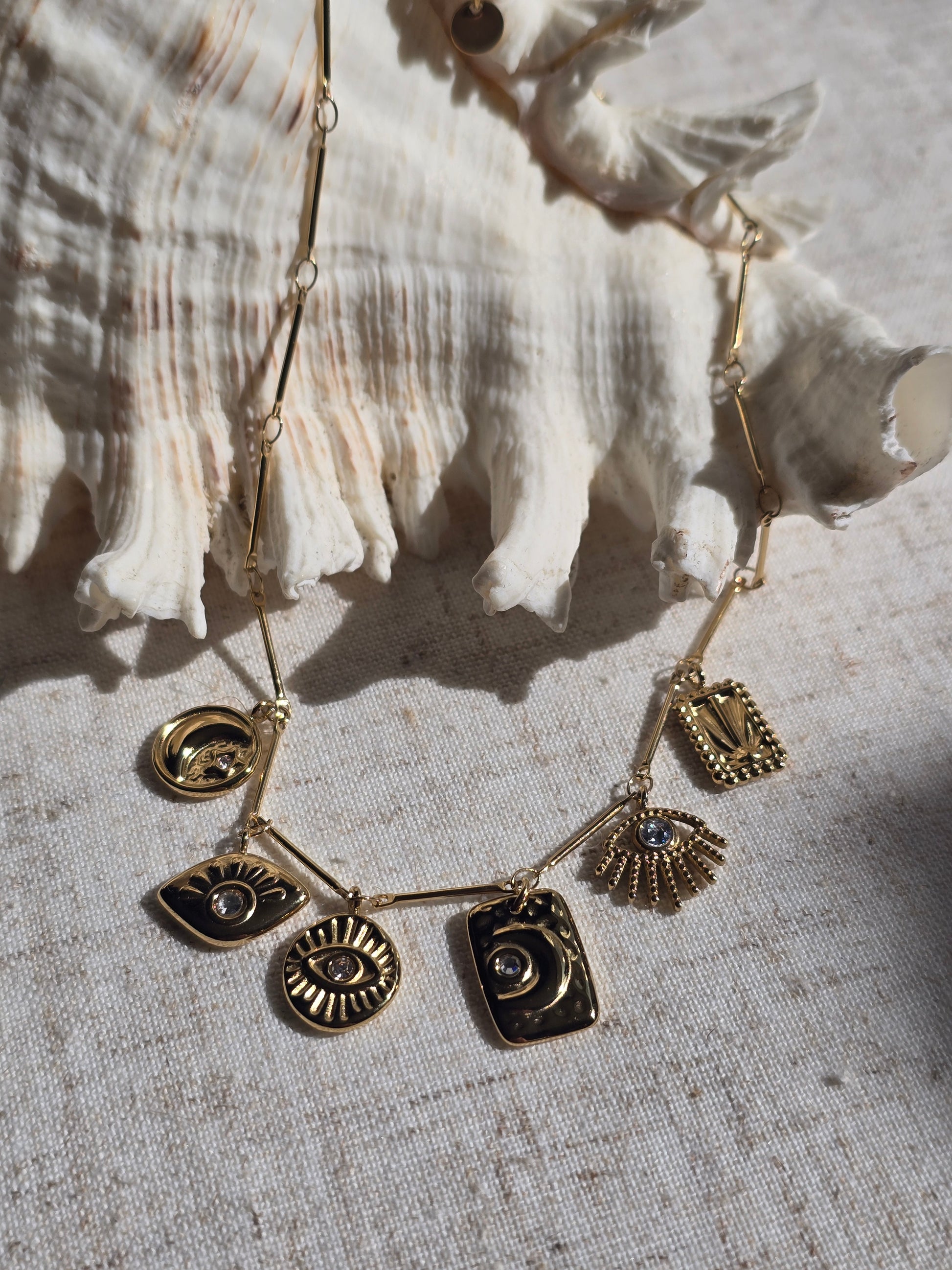 Ce collier doré est un véritable talisman. Grâce à ses charms gravés, notamment le célèbre œil de Nazar, symbole ancestral contre le mauvais œil, il vous accompagne comme un allié protecteur au quotidien.