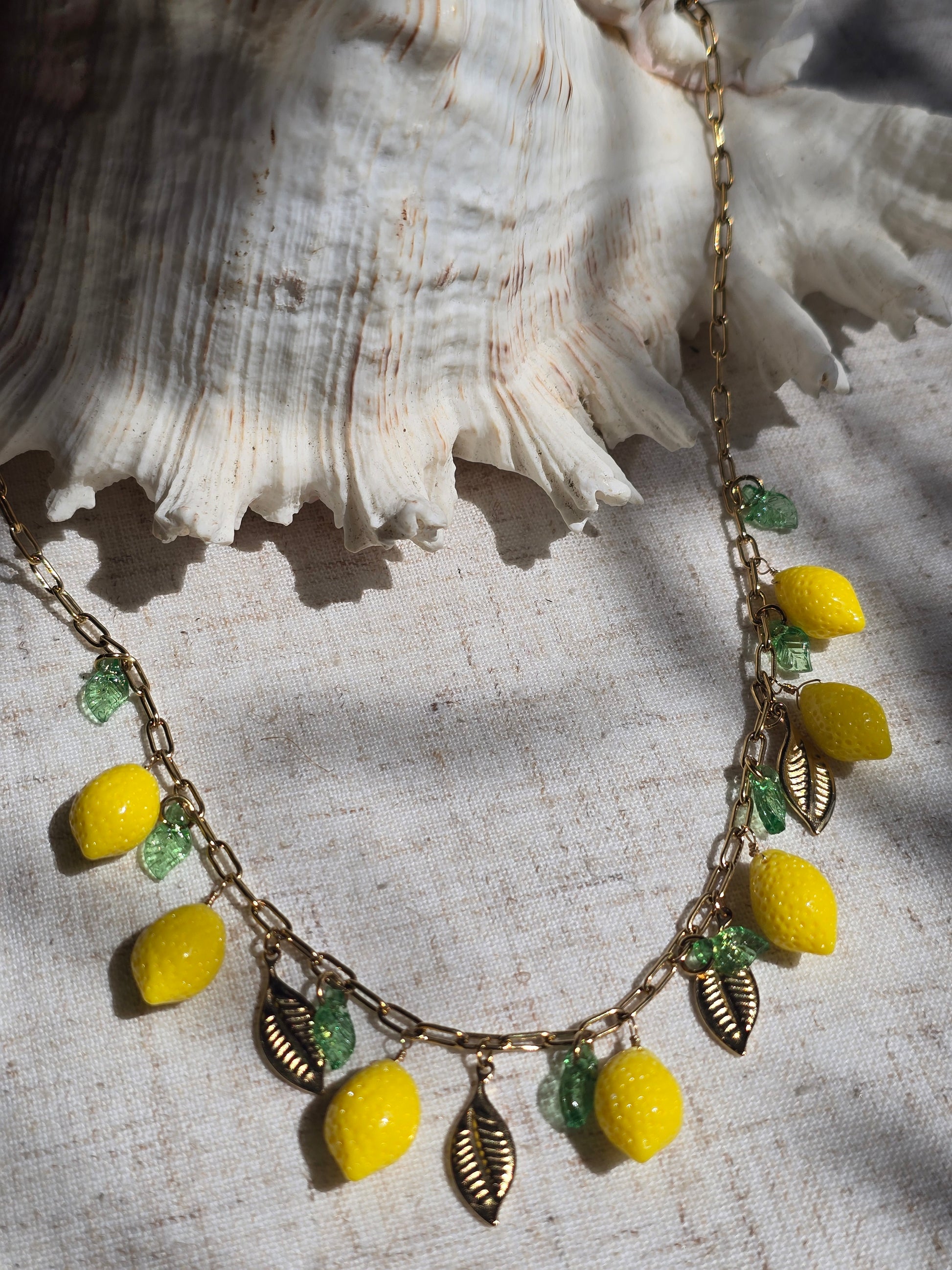 Monté sur une chaîne dorée à maillons larges, il alterne de façon ludique des mini citrons jaunes brillants, des feuilles vertes translucides, et des breloques feuillage doré qui dansent à chaque mouvement.