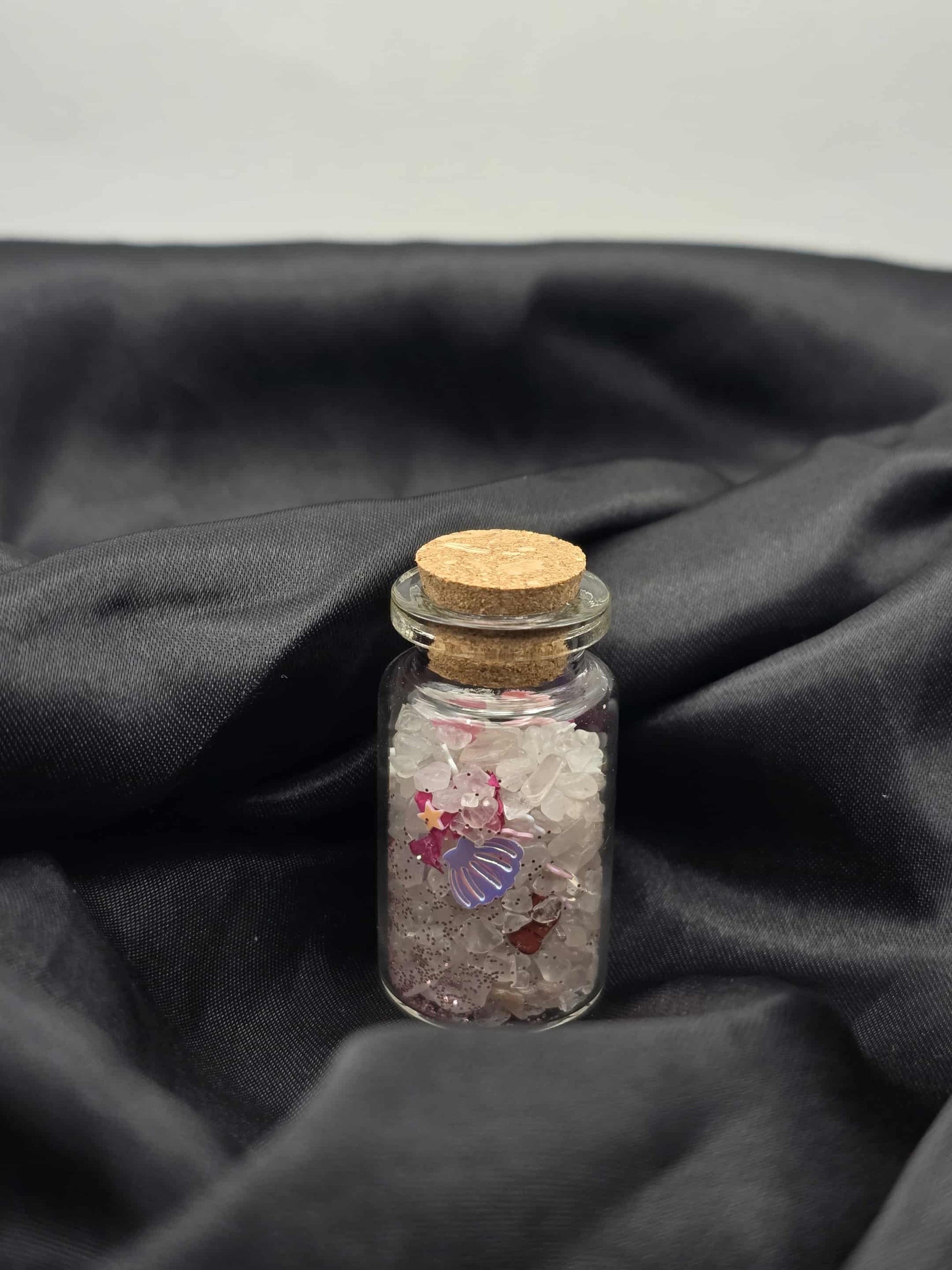 Cette fiole d'amour est composée de Quartz rose, pétales de rose séchées et de cristal de roche .