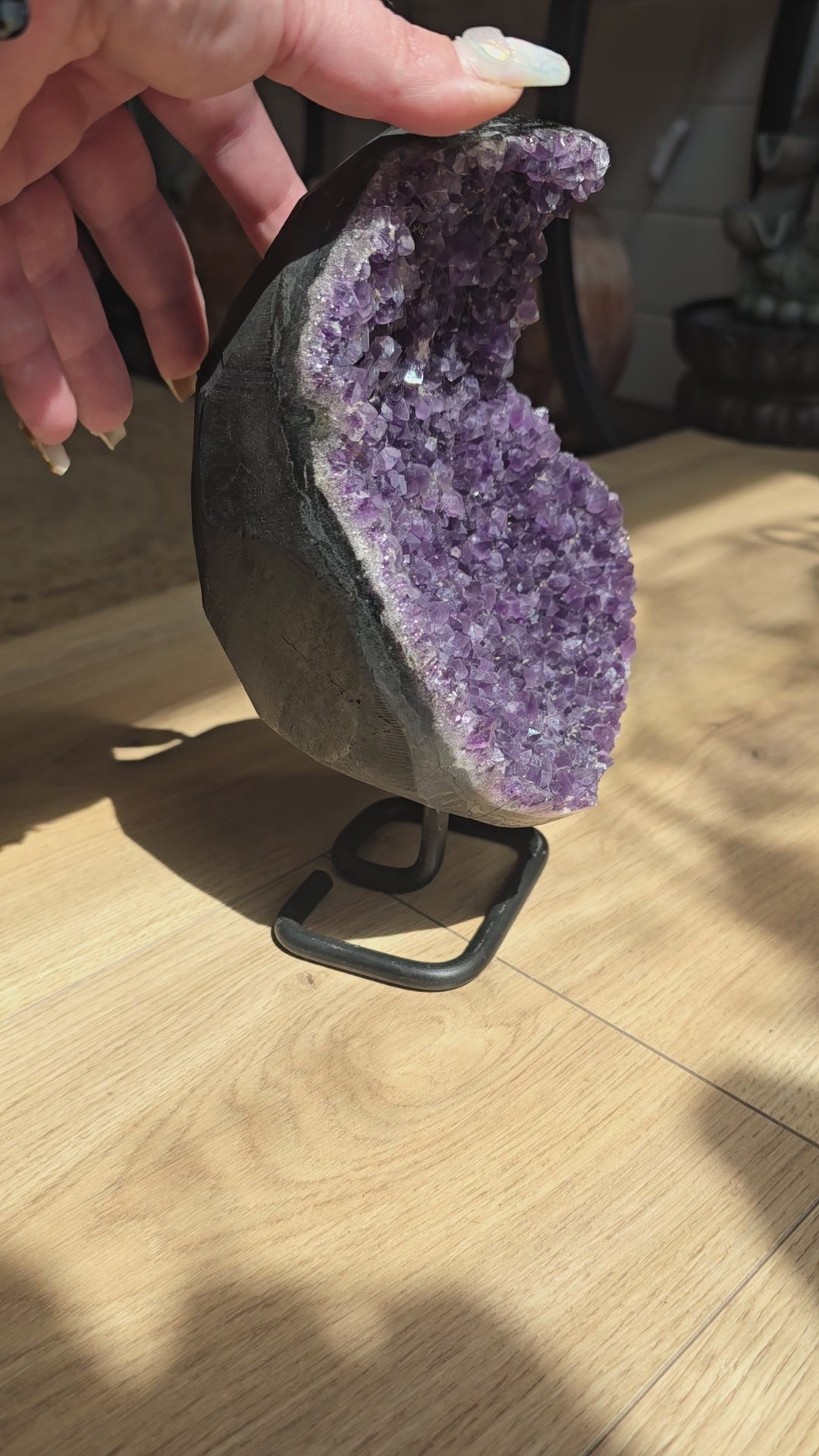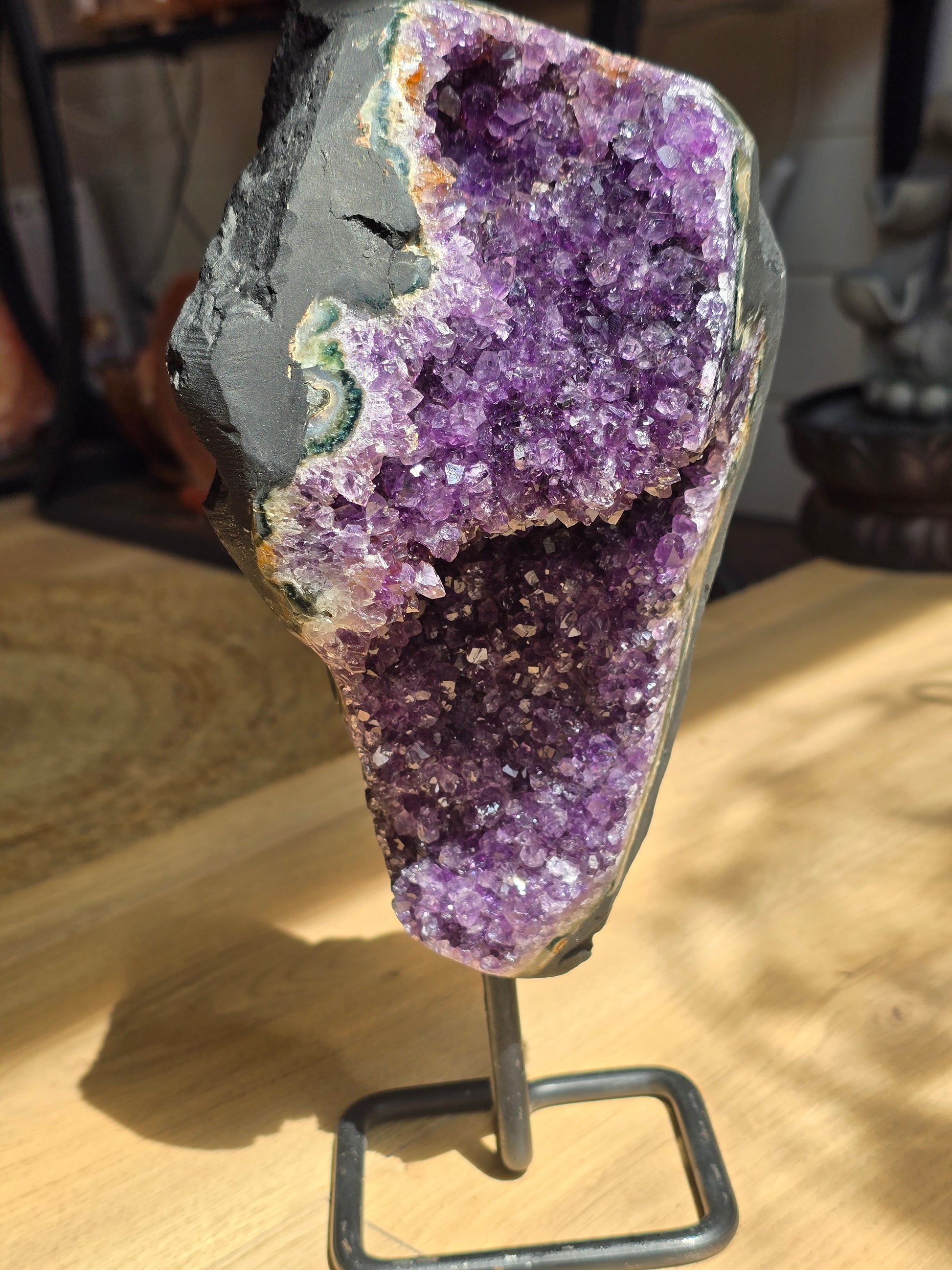 Sublimez votre intérieur avec cette géode d'améthyste naturelle du Brésil, montée sur un socle métallique pour une mise en valeur élégante et stable