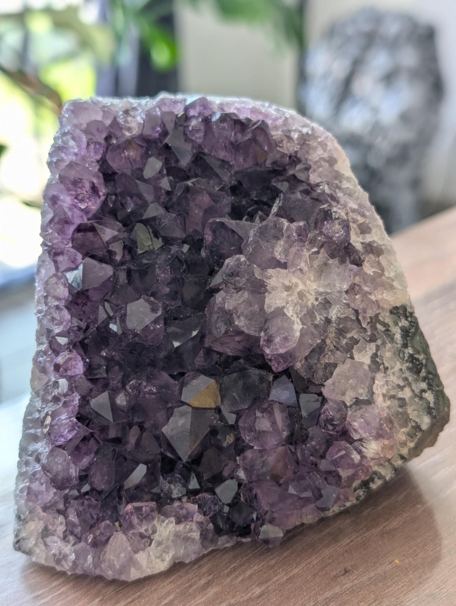Cette pièce unique de qualité AA révèle des cristaux violets profonds et brillants, symbole de sagesse et d'harmonie spirituelle