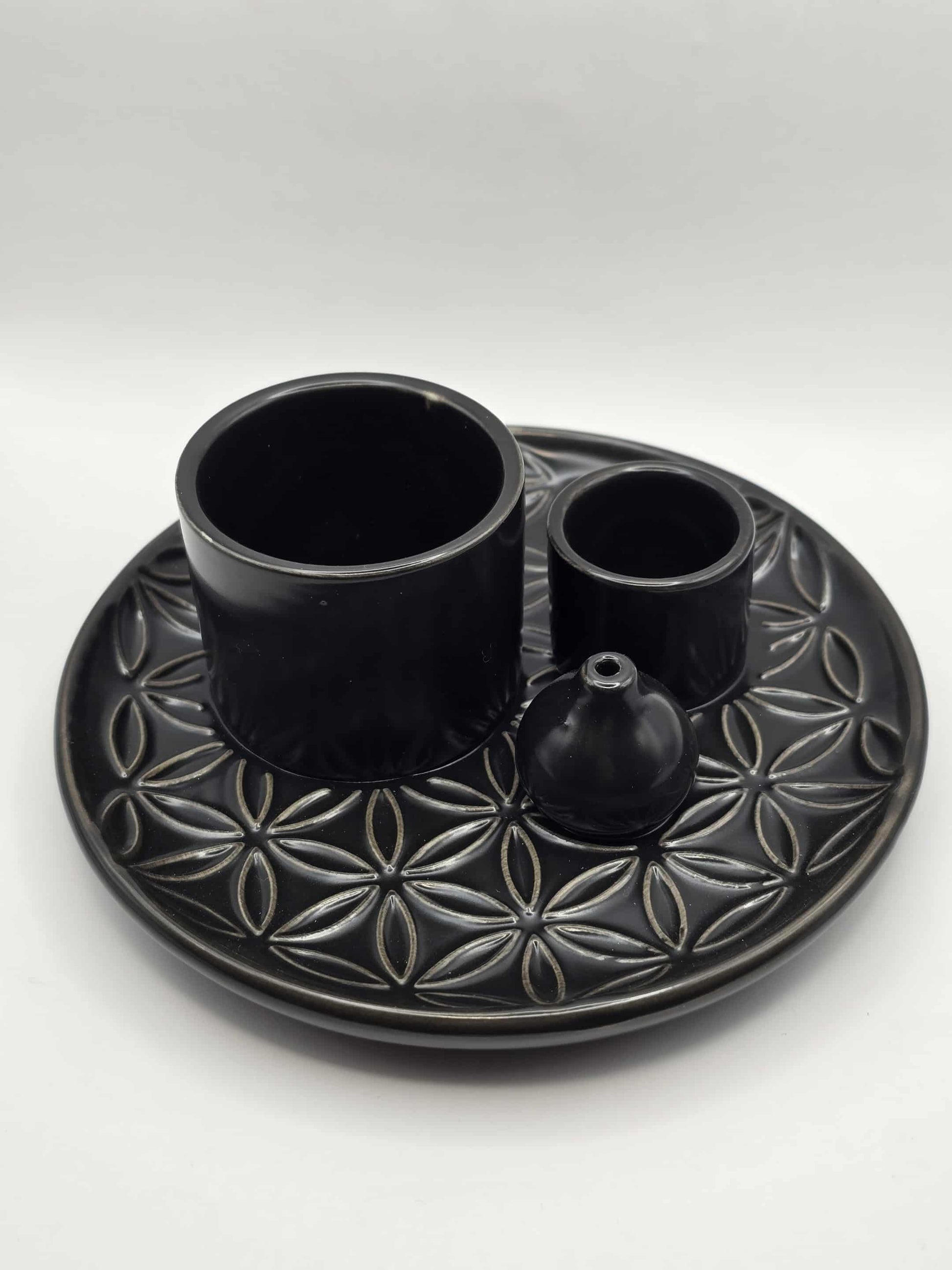 Un porte-encens élégant en céramique noire, décoré du symbole sacré de la Fleur de Vie. Polyvalent, il accueille palo santo, sauge blanche, encens en cônes, bâtonnets et même bombitas